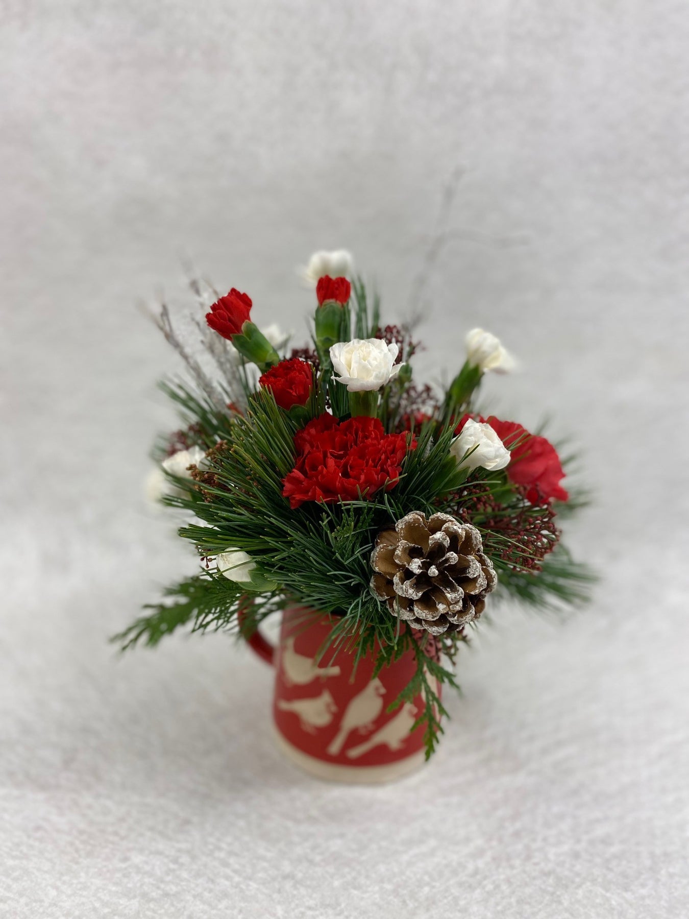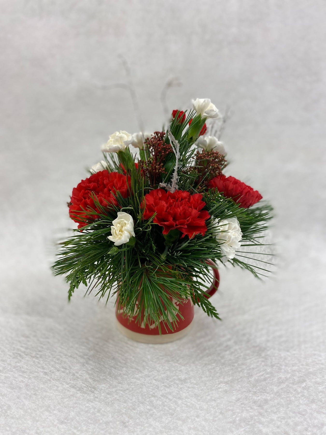 A lovely, fresh arrangement in traditional holiday colours of white, red and green! While the flowers will warm their heart, the keepsake mug will help warm everything else afterwards! Includes long lasting carnations, fragrant greens and a frosted pine cone.