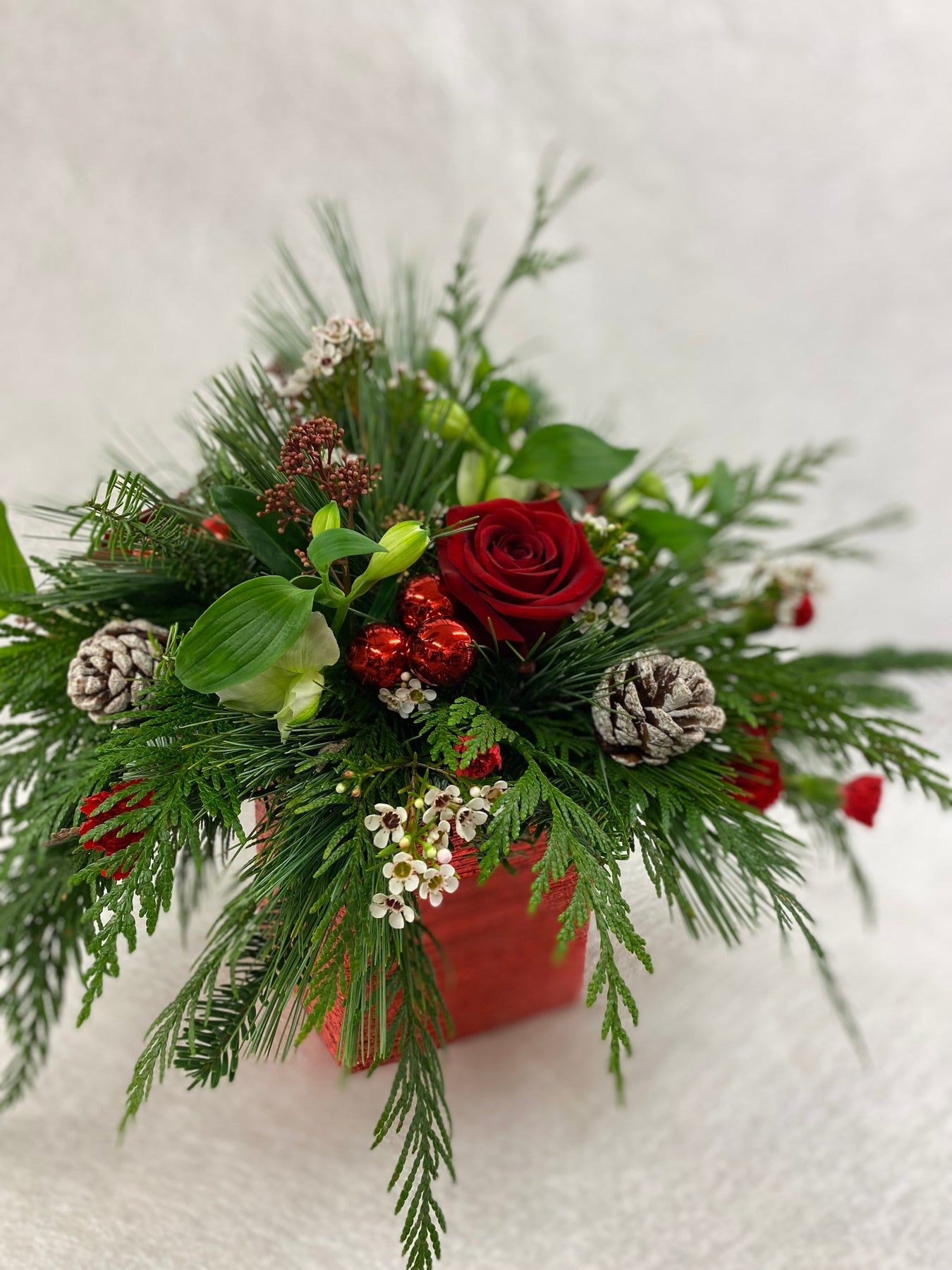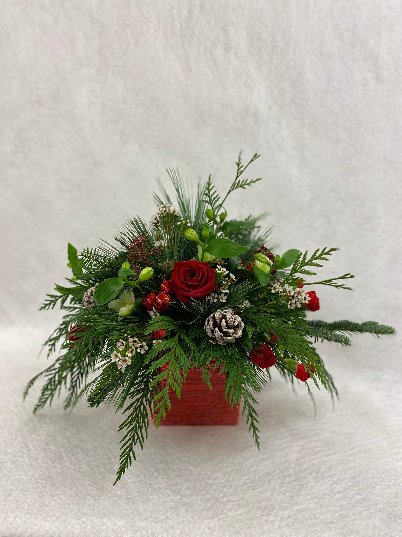 Bright red roses and mini carnations, pretty white alstresia and wax flower are set within a lush array of fragrant winter greens and set in a shimmering red cube vase. Accented with 'snow tipped' pine cones and shiny baubles, this is a lovely gift to celebrate the red, white and green colours of Christmas!