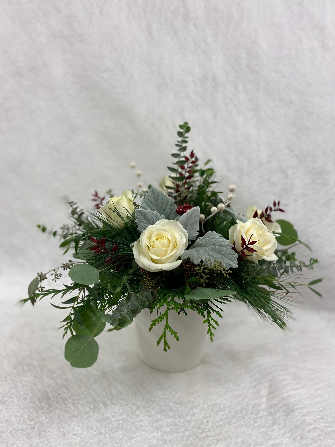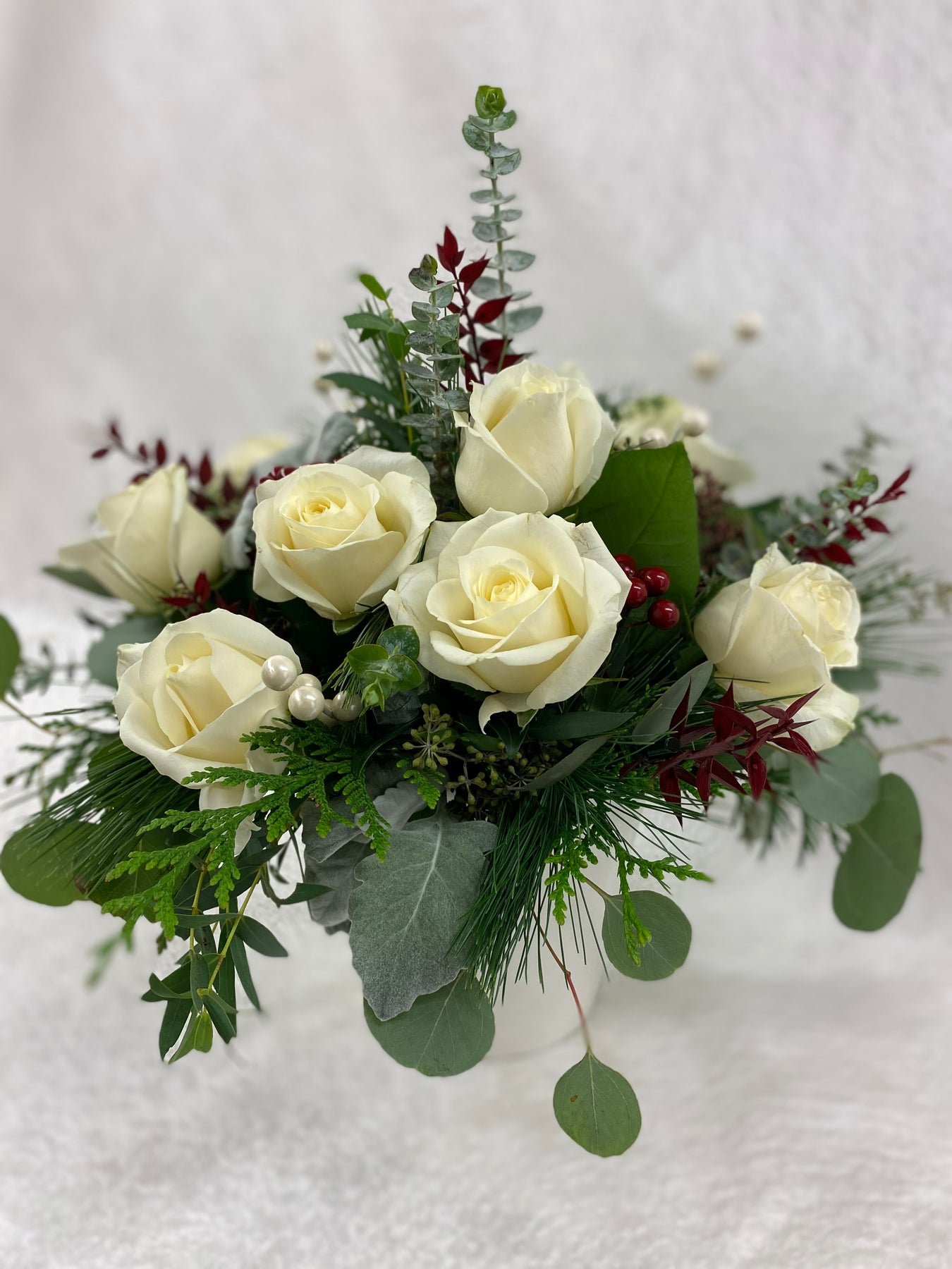Bright white roses, silver dusty miller and airy eucalyptus stems give this beautiful arrangement the feel of a crisp winter sky! Set in a lovely white ceramic vase, this is a clean, classy, elegant piece they will surely love... no matter what the weather is doing!
