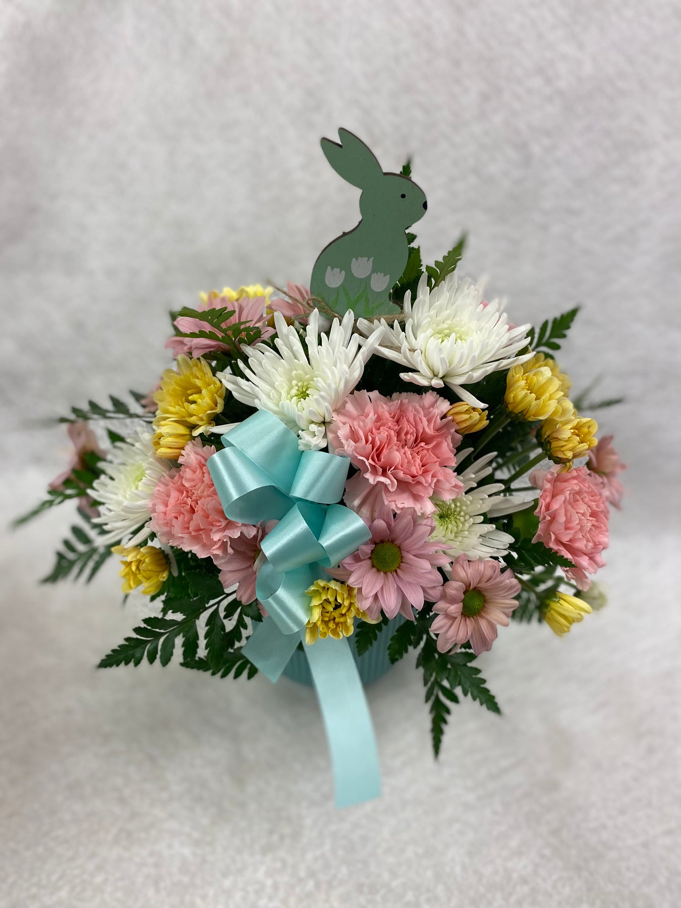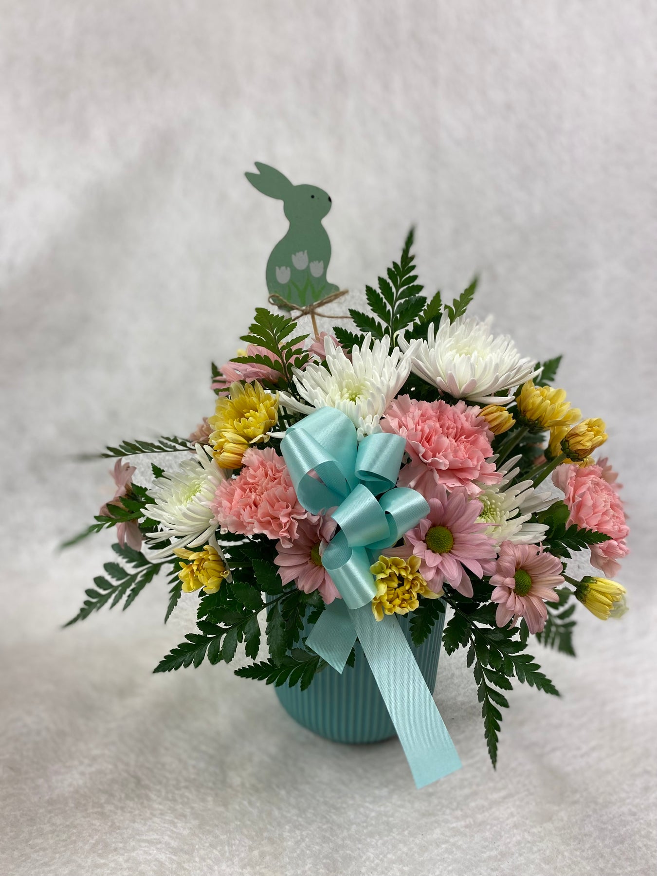 Blues, blooms... and a bunny too! Enjoy a burst of Easter colour with soft-toned mums and carnations, all set in a pretty blue ceramic vase, accented with a satin bow and corresponding seasonal pick.