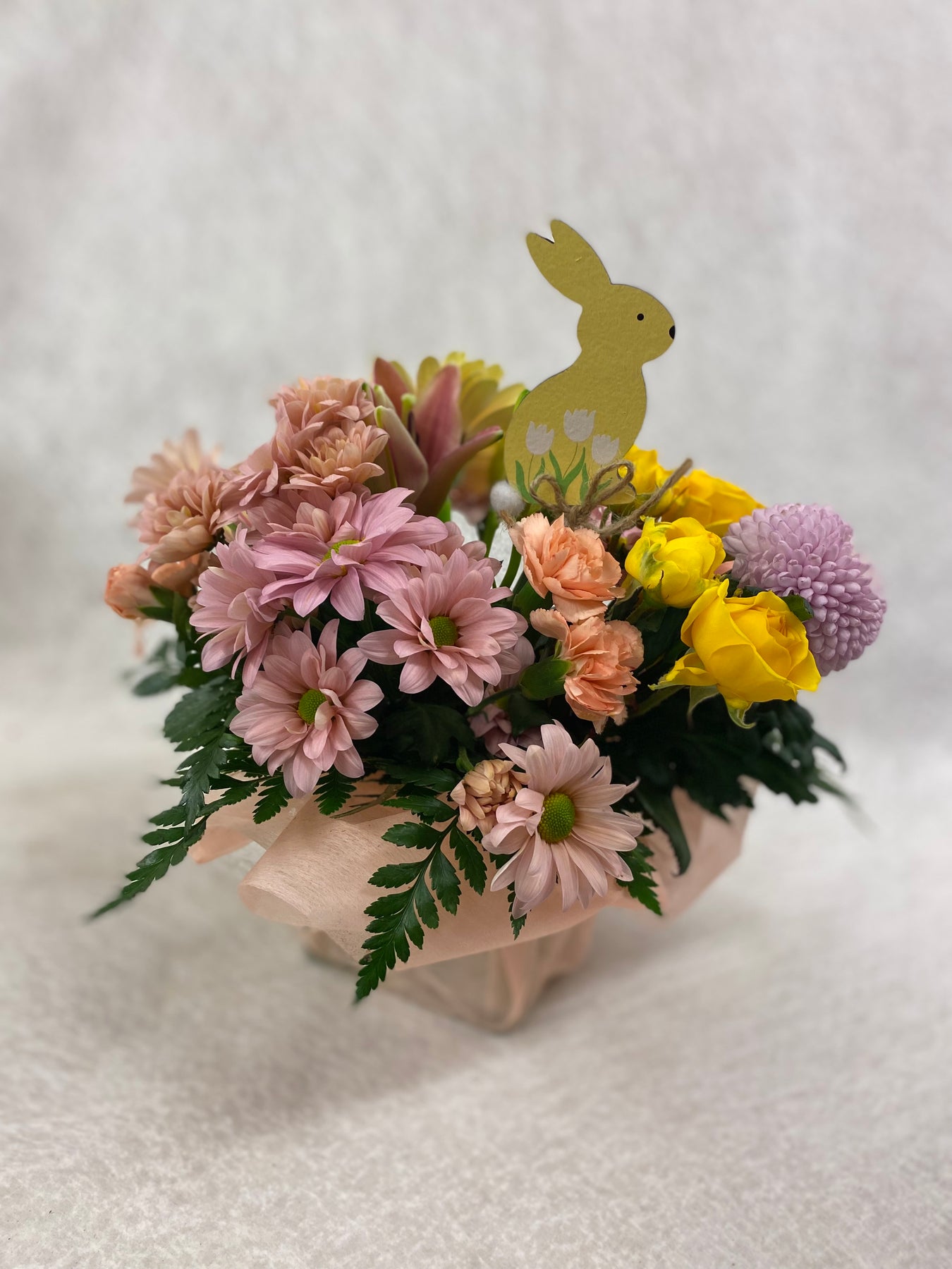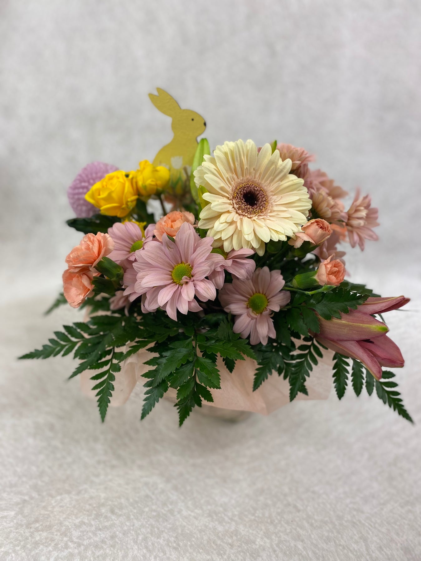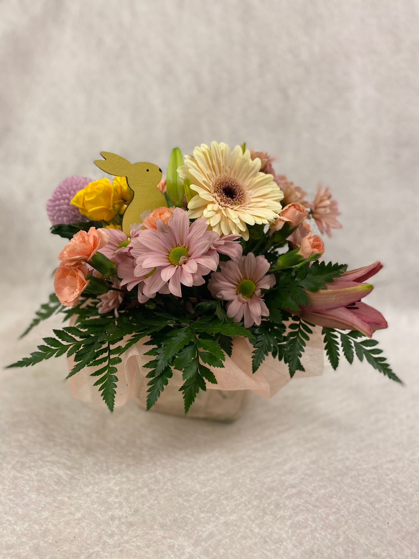 See if you can spy the bunny nestled in this beautiful collection of pastel blooms! Includes long lasting mums, mini carnations, spray roses and lilies, all set in a delicately wrapped cube vase.