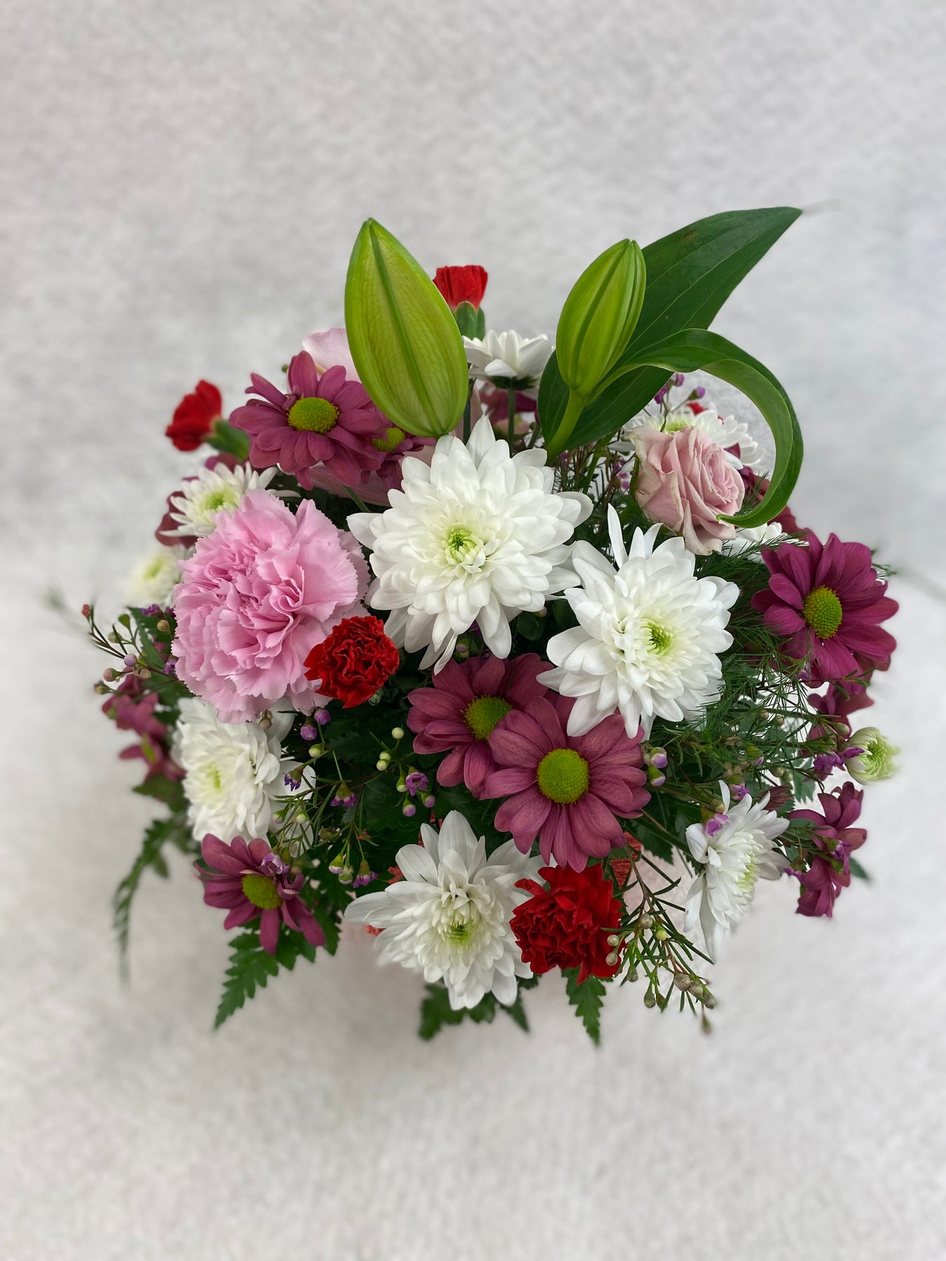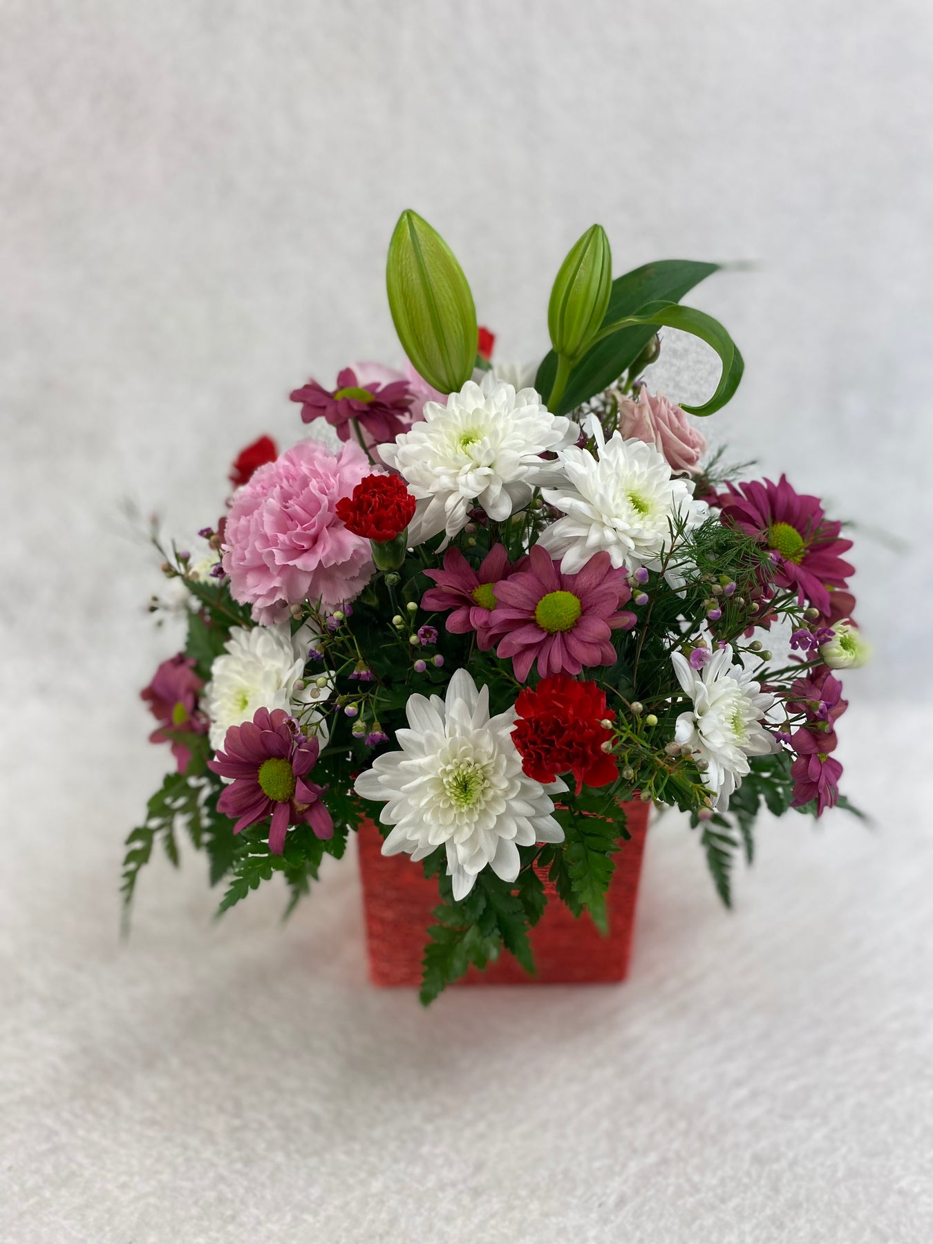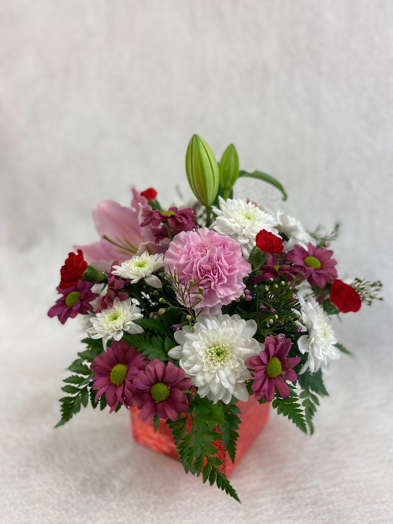 With a riot of pinks including baby pink, bubblegum pink and raspberry pink, with pops of red and white too, this is the floral version of a Valentine's Day card set in a shimmery red cube vase. Makes a wonderful gift for friends, loved ones and anyone who might appreciate a little Valentine's Day cheer!